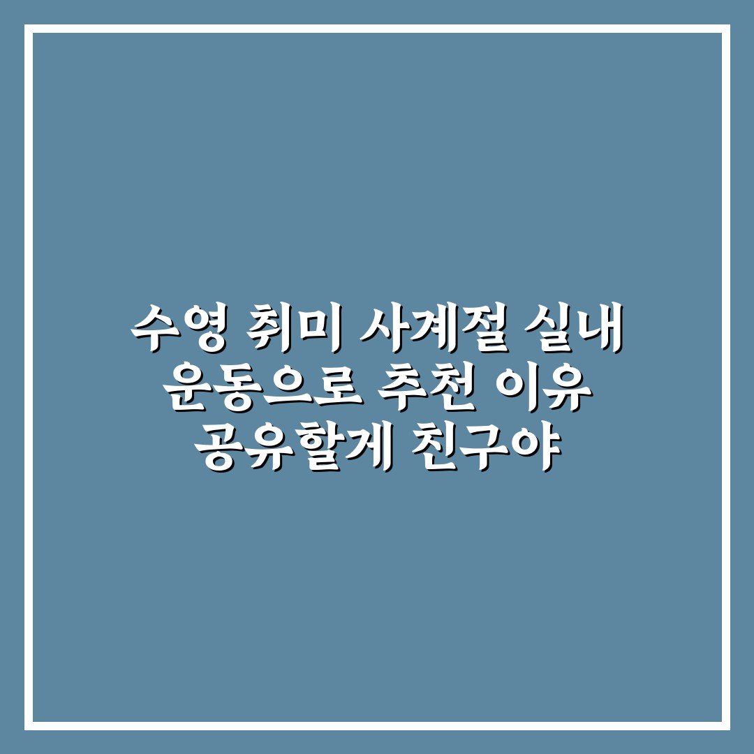 수영 취미 사계절 실내 운동으로 추천 이유 공유할게 친구야 2026년 04월 17일 by 주인장 사계절 내내 즐길 수 있는 수영 취미! 실내 운동으로 건강과 재미를 동시에 챙기는 이유를 친구에게 공유해요.